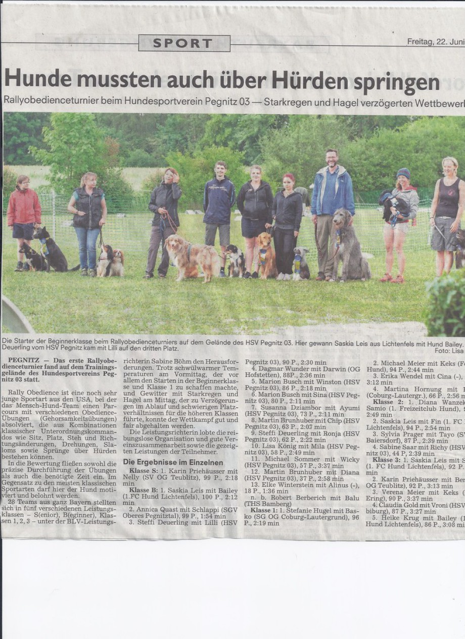 Die Beginnerklasse gewann Elke Winterstein mit Alinus mit 99 von 100 möglichen Punkten (2:16 Min), gefolgt von Melissa Habermann mit Ella (HSV Bamberg / 99 / 2:27) und Marion Busch mit Winston (HSV Pegnitz / 82 / 2:33). In Klasse 1 setzte sich Ulrike Höhn mit Fox (GSV Bad Kissingen / 99 / 2.26) vor Marion Busch mit Sina (HSV Pegnitz / 96 / 2:29) und Steffi Deuerling mit Lilli (HSV Pegnitz / 86 / 2:32) durch. Die Klasse 2 gewann Jana Schiener mit Bailey (Flinke Pfoten Kulmbach / 98 / 2:58), Platz 2 belegte Ruth Schroetel mit Ayla (HSV Nürnberg Nord-West / 70 / 4:09). In der Königsdisziplin, der Klasse 3, holte Barbara Reissner mit Shiva (HSG Nürnberg-Land / 85 / 3:44) den Sieg, dicht gefolgt von Dorothea Maisel mit Tom (83 / 3:09) und Ulrike Höhn mit Chipsy (63 / 3:15).